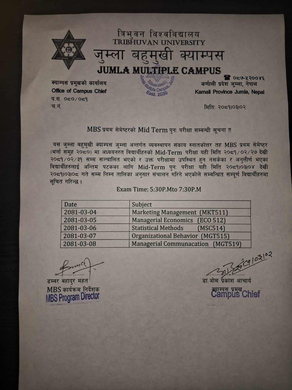 MBS प्रथम सेमेष्ट्रको Mid-Term परीक्षा पुनः सञ्चालन सम्बन्धी सूचना।